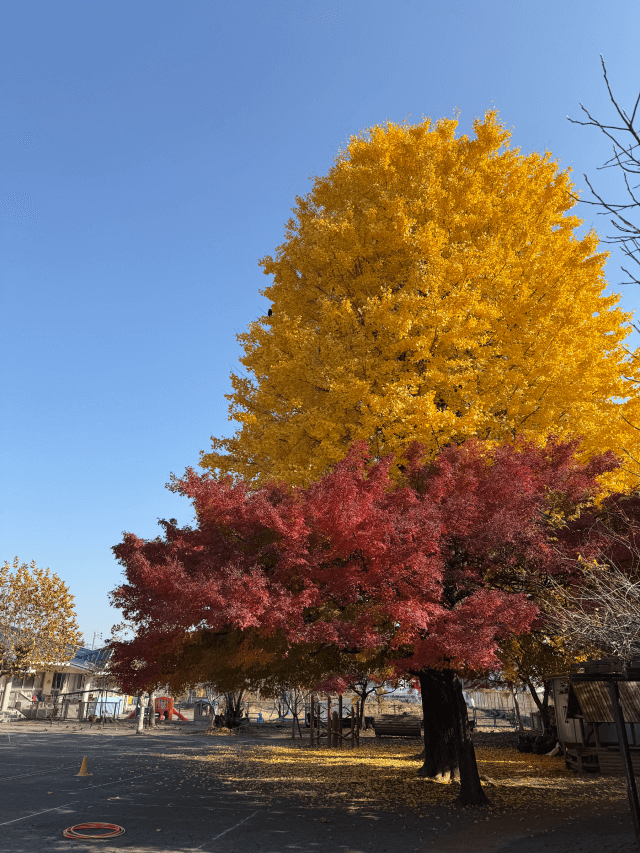 園庭のイチョウやモミジがすっかり色づき、大野こども園は紅葉真っ盛りです。寒さに負けず、元気に遊べるといいですね。